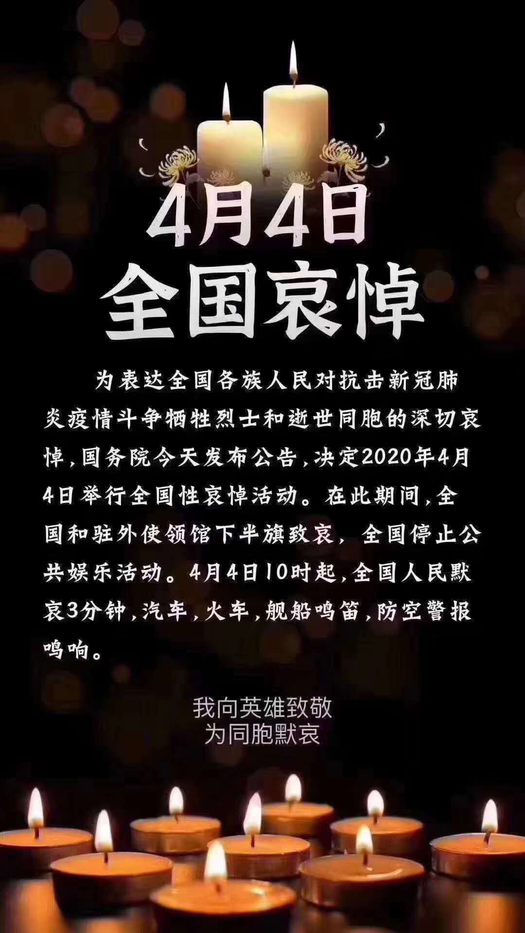 為表達全國各族人民對抗擊新冠肺炎疫情斗爭犧牲烈士和逝世同胞的深切哀悼,國務(wù)院發(fā)布公告,決定2020年4月4日舉行全國性哀悼活動。在此期間,全國和駐外使領(lǐng)館下半旗致哀,全國停止公共娛樂活動。4月4日10時起,全國人民默哀3分鐘,汽車、火車、艦船鳴笛,防空警報嗚響。